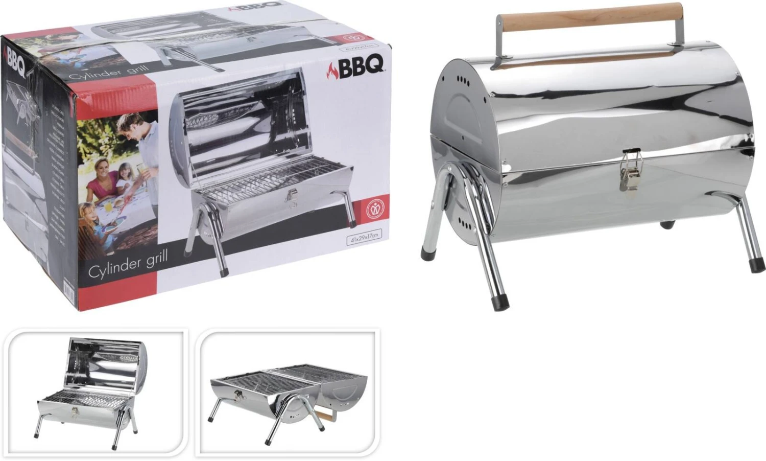 The portable stainless steel BBQ grill in silver is ideal for camping and picnics, having a barbecue at the beach or garden.